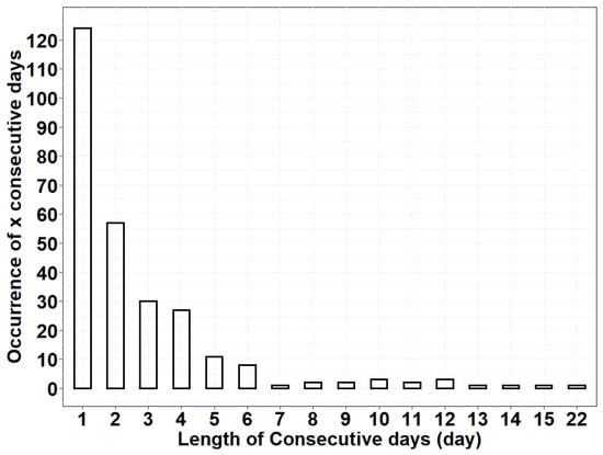 The duration of the CRDEs ranged from 2 to 22 consecutive days. The most frequent durations of CRDEs were 2, 3, 4, 5, and 6 days, with the entire range from 8 to 57 days. The highest occurrence (57) was obtained with 2 consecutive days of rainfall events. The longest duration (22 days) of consecutive days of rainfall events corresponds to the period from 5 to 26 November 2020.