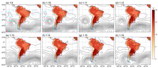 The heatwave that occurred in South America from 9 to 16 January 2022 for (a) 1.9, (b) 1.10, (c) 1.11, (d) 1.12, (e) 1.13, (f) 1.14, (g) 1.15, (h) 1.16. The shaded is the daily average near-surface temperature, in units of °C, and the contour is the geopotential heights at 500 hPa with ranges from 4800 to 6000 gpm and interval as 40 gpm. The area represented by the black box is where a heatwave occurred (The black box in the pictures below represents the same meaning).