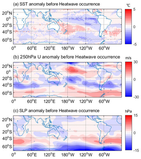 Figure 3 illustrates the evolution of TN flux over the region with an increased meridional SST gradient in the South Pacific before the occurrence of the heatwave. On January 4 and 5, the wave activities were amplified over the South Pacific (Figure 3a,b). Then, the anomalies propagate eastward to South America, leading to the establishment of a high-pressure system in the region on 6 January (Figure 3c). On 7 and 8 January, the wave train from the South Pacific to South America persisted (Figure 3d,e) and eventually dissipated on 9 January (Figure 3f). It is obvious that the wave train from the South Pacific to South America emerged before the heatwave event. This diagnosis suggests that the eddy activities over the heatwave area are strongly connected with the propagation of an anomalous wave train from South Pacific to South America.