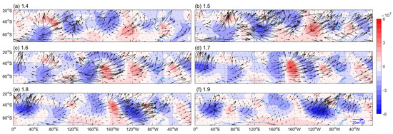 The horizontal component of TN flux at 250 hPa. The shaded represents perturbation of the stream function, in units of m2/s, and the arrow represents the horizontal component of TN flux, in units of m2/s2. For (a) 1.4, (b) 1.5, (c) 1.6, (d) 1.7, (e) 1.8, (f) 1.9. The blue arrow at the bottom right of (f) represents the quiverkey in units of m2/s2.