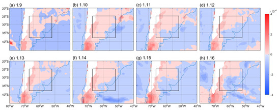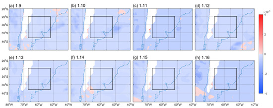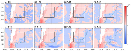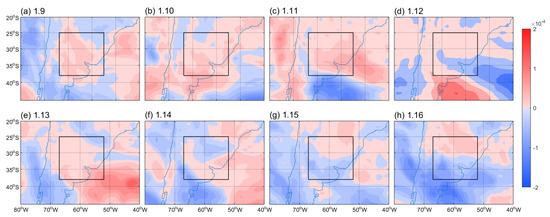 Figure 1 illustrates the gradual buildup of high-pressure systems in northern Argentina and Uruguay from 9 to 16 January, which serves as the main cause of the heatwave event. On January 9, the area of interest (depicted by the black box) was situated between a strong ridge to the west and a trough to the east in the westerlies (Figure 1a). From 9 to 13 January, the western ridge gradually transformed into an independent anticyclone and eventually merged with the subtropical high over the South Atlantic on January 14, forming a large anticyclone (Figure 1b–f). This development of the anticyclone coincided with a notable increase in surface temperatures, indicating the occurrence of the heatwave event. From 15 to 16 January, the anticyclone gradually retreated equatorward, marking the end of the heatwave event (Figure 1g,h). The development of the anticyclone from the ridge suggests a potential contribution from wave activities in the westerlies. According to Rodrigues et al. [29], disturbances originating from the tropics, such as the rapid warming of the Indian Ocean, can trigger Rossby waves towards the mid-latitudes in the SH, leading to weather anomalies in South America. This highlights the significant impact of wave trains originating from upstream regions on weather processes in South America.