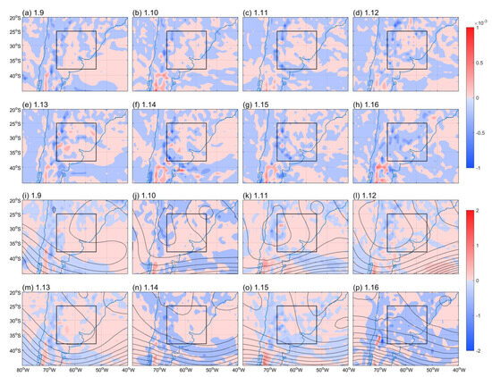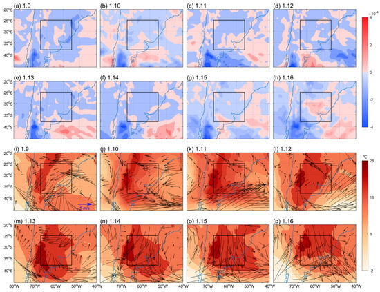 Next, the contribution of the adiabatic heating from the vertical motion term is examined. From Figure 6a–g, the vertical motion term mainly contributes positively in the heatwave area, which is also consistent with the evolution of the high-pressure system in Figure 1. On 16 January, the last day of the heatwave, as the high-pressure system retreated northwards, the vertical motion weakened, resulting in negative anomalies of vertical motion term (Figure 6h). As shown in Figure 6i–p, in the area where heatwave occurs, the early stage is dominated by the downward movement controlled by high pressure. During the last days of Figure 6o,p, due to weakening of the high-pressure system, the subduction turns into an ascending motion. In general, the contribution of vertical motion to temperature has a good correspondence with the vertical velocity. Overall, the vertical motion term plays a crucial role in the local temperature increase. Taking into account the general circulation analysis in the last section, the high-pressure system in the SH, triggered by the wave train, induces a downward motion, which subsequently results in adiabatic warming. This adiabatic warming emerges as a dominant factor contributing to the local temperature increase during the heatwave event.