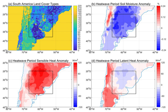 Surface condition during the 2022 South America heatwave: (a) the land cover of South American underlying surfaces, (b) soil moisture (0–7cm) anomaly, (c) sensible heat anomaly, and (d) latent heat anomaly (units: W/m2). (Note in (a) numbers represent different land cover types. 10—cropland, rainfed; 20—cropland, irrigated or post—flooding; 30—mosaic cropland/natural vegetation; 40—mosaic natural vegetation/cropland; 50—tree cover, broadleaved, evergreen, closed to open; 60—tree cover, broadleaved, deciduous; 70—tree cover, needleleaved, evergreen; 80—tree cover, needleleaved, deciduous; 90—tree cover, mixed leaf type; 100—mosaic tree and shrub/herbaceous cover; 110—mosaic herbaceous cover/tree and shrub; 120—shrubland; 130—grassland; 140—lichens and mosses; 150—sparse vegetation; 160—tree cover, flooded, fresh, or brackish water; 170—tree cover, flooded, saline water; 180—shrub or herbaceous cover, flooded, fresh/saline/brackish water; 190—urban areas; 200—bare areas; 210—water bodies; 220—permanent snow and ice).