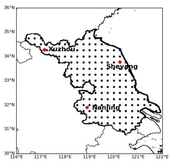 Spatial distribution of the radiosonde sounding sites (red dots) and ERA5 grids (black dots) over Jiangsu, China.