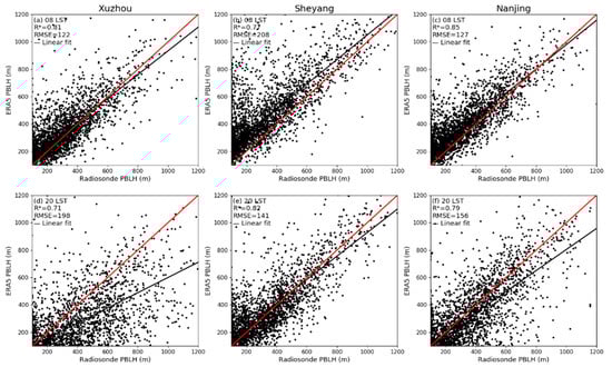 Scatter plots of planetary boundary layer height (PBLH) derived from ERA5 and sounding datasets at (top) 08:00 LST and (bottom) 20:00 LST at the (a,d) Xuzhou, (b,e) Sheyang, and (c,f) Nanjing sites. R is the correlation coefficient, the star superscript indicates the value that is statistically significant (p < 0.01), RMSE is the root mean square error, the black solid line is the fitting line, and the red solid line is the reference line.