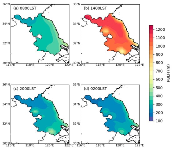 Spatial distribution of the average PBLH over Jiangsu, China, from 1979 to 2019: (a) 08:00 LST, (b) 14:00 LST, (c) 20:00 LST, and (d) 02:00 LST.