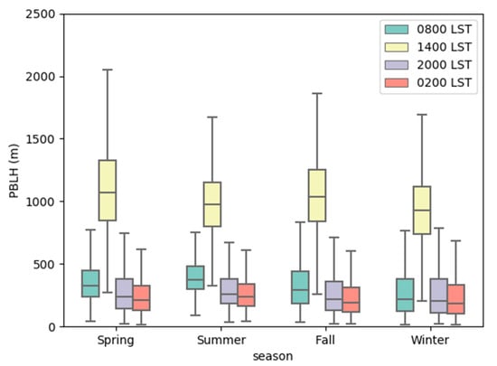 Box-and-whisker plot of ERA5 PBLH during each season at 08:00, 14:00, 20:00, and 02:00 LST during the period from 1979 to 2019 over Jiangsu, China.