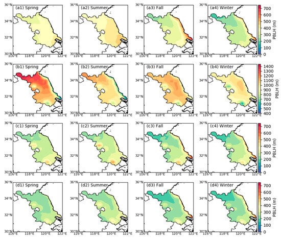 Spatial distributions of the seasonal mean PBLH at 08:00 LST (a1–a4), 14:00 LST (b1–b4), 20:00 LST (c1–c4), and 02:00 LST (d1–d4) over Jiangsu, China.