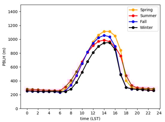 Seasonal diurnal cycles of the mean PBLH throughout Jiangsu, China. The orange, red, blue, and black lines indicate spring, summer, fall, and winter, respectively.