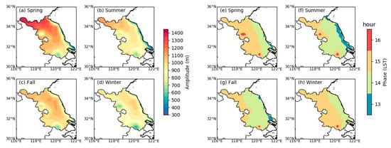 (a–d) Amplitude and (e–h) phase of the diurnal cycle of the PBLH over Jiangsu, China, for each season. Amplitudes are mean values of daily maximum minus daily minimum, and phases are the hour of maximum PBLH.