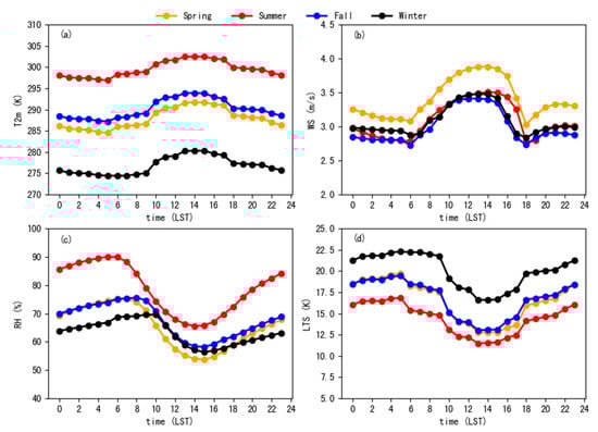 In addition to solar radiation, the PBLH also has a significant relationship with meteorological factors [20]. According to a study by Gu et al. [45], the diurnal cycle of the PBLH is significantly positively correlated with the near-surface temperature and negatively correlated with the relative humidity. Zhang et al. [25] noted that higher surface temperature and lower relative humidity lead to higher sensible heat flux and lower latent heat flux, resulting in deeper convection and a higher PBLH. To further understand the influence of meteorological factors on the diurnal cycle of the PBLH in Jiangsu and analyze the reason for the seasonal variation in the diurnal cycle, we study the diurnal cycles of several meteorological factors in the four seasons and calculate the correlations between them and the PBLH. The selected meteorological factors include 2 m temperature (T2m), 10 m wind speed (WS), near-surface relative humidity (RH), and lower tropospheric stability (LTS). LTS is defined as the potential temperature difference between 700 hPa and the surface, which can represent the thermodynamic state of the low troposphere. A larger LTS usually reflects a more stable low troposphere [48,49].