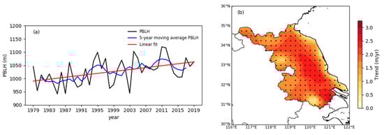 In addition to the climatic characteristics and influencing factors of the PBLH, the long-term variation trend of the PBLH is another issue that needs attention. We calculated the variation trend of the annual mean PBLH from 1979 to 2019 in Jiangsu. The results show that the daytime PBLH had a significant increasing trend (Figure 9), while the PBLH at night had no significant variation trend (not shown), which is consistent with the results of Zhang et al. [31] and Gu et al. [45]. Figure 9a shows the time series of the daytime (14:00 LST) annual mean PBLH in Jiangsu. As shown in the figure, the daytime PBLH had an increasing trend, especially since the 1990s, when the PBLH had obviously increased. Figure 9b shows the trend of the PBLH in Jiangsu. The results show that the PBLH in most areas of Jiangsu had a significant growth trend, and the fastest growing areas were in the central and southern areas of Jiangsu, with the highest trend reaching 3 m·yr−1.