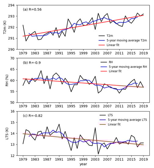 Same as Figure 9a, but for the time series of (a) T2m, (b) RH, and (c) LTS. R is the correlation coefficient between the annual mean PBLH and meteorological variables.