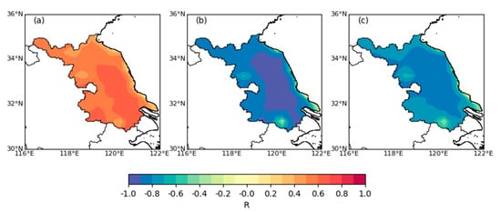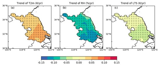 To explore the reason for the increase in the daytime PBLH, we analyze the variation trend of the impact factors from 1979 to 2019. The results show that daytime T2m, RH, and LTS had significant variation trends (Figure 10 and Figure 11), but WS had no significant variation trend (not shown). Figure 10 shows the time series of the daytime (14:00 LST) annual mean T2m, RH, and LTS and the correlation coefficients with the annual mean PBLH. The annual mean PBLH has a significantly positive correlation with T2m, with a correlation coefficient of 0.56 (Figure 10a), and a significantly negative correlation with RH and LTS, with correlation coefficients of −0.9 and −0.82, respectively (Figure 10b,c). At the same time, we also find that in the past 41 years, T2m had obviously increased, and RH and LTS had obviously decreased, especially since the 1990s. This is consistent with the findings of Xia et al. [53] and Chen et al. [54]. Therefore, we can calculate the variation trend of meteorological factors in Jiangsu (Figure 11). The results show that T2m had a significantly increasing trend, and RH and LTS had significantly decreasing trends. At the same time, we find that the spatial distribution of the variation trend of meteorological factors was similar to that of the PBLH; that is, the T2m in the southern area increased faster than that in the northern area, and the RH and LTS also decreased faster, which may be the reason for the faster growth of the PBLH in the south.