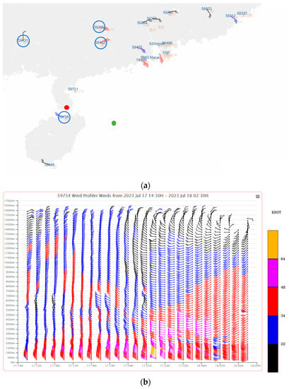 (a) The 925 hPa winds from the wind profilers at 1000 UTC 17 July 2023, with the location of the wind profilers of stations 59,268, 59,431 Nanning, 59,462 Luoding, and 59,758 Haikou are highlighted in blue circles. The location of wind profiler at station 59,754 Xuwen at 20.24° N, 110.16° E and an offshore platform at 19.65° N, 112.11° E over the south China coastal waters are indicated by a red dot and a green dot, respectively; and (b) time series of radar wind profiler observations at station 59,754 (Xuwen) from 0630 UTC to 1830 UTC 17 July 2023. Yellow wind barbs indicate hurricane force winds (≥64 knots).