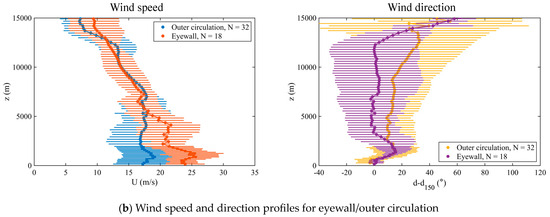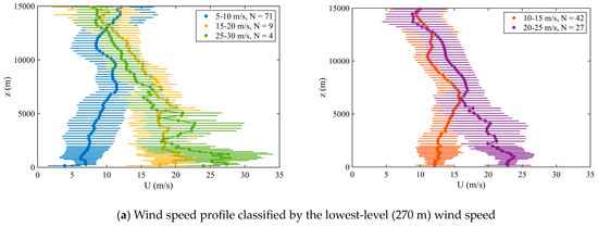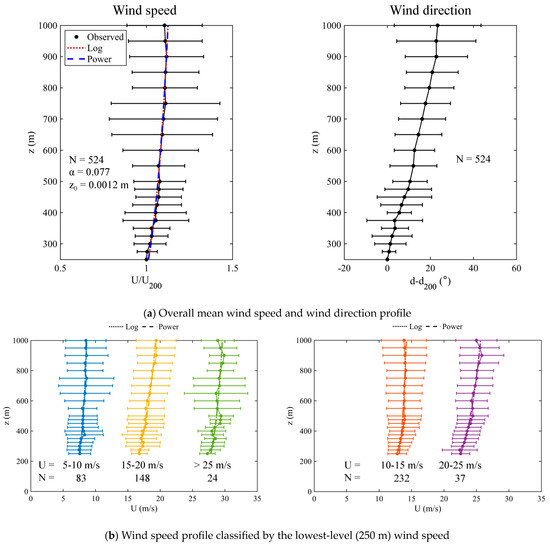 The vertical wind profiles measured by the Xuwen profiler are analysed further in Figure 4. Different stratifications of wind speeds were tried out, e.g., based on the lowest-level (i.e., 270 m) wind for different wind speed classes (Figure 4a), and the distance from the centre of Talim (Figure 4b). It could be seen that, at relatively higher wind speed (e.g., above around 15 m/s at a height of 270 m) and for both the eyewall and the outer circulation, there is a clear signature of the low-level jet, with a height of around 500 m to 1000 m above the sea surface. This would have important implications for the design of wind code for tall buildings in the region to withstand the strong winds associated with tropical cyclones. For the wind direction (Figure 4b), there was clockwise rotation of the wind below 2000 m or so and then anticlockwise rotation aloft between 2000 m and 4000 m. The veering of winds would have important applications in wind engineering as well (such as Weerasuriya et al. [11]). The wind speed profiles below 1000 m were fitted to the log law and power law in Figure 5 based on different stratifications of wind speeds. In general, the vertical wind shear below 1000 m is very low. This is probably because the wind profiler is located in a smooth and flat terrain near the coast. The log law and power law can be used to describe the vertical wind profiles despite some “kinks”. Such kinks have also been reported in previous observational studies of tropical cyclone wind profiles at coastal locations, e.g., Tse et al. [12]. The kinks may be caused by coastal internal boundary layer (IBL) development due to the terrain transition across the coastline.