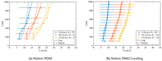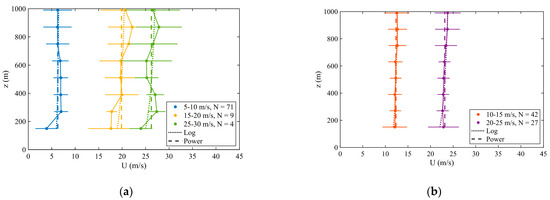 Wind speed profiles below 1000 m fitted with log law and power law based on different stratifications of wind speeds at Xuwen. (a) 5–10, 15–20, and 25–30 m/s; (b) 10–15, and 20–35 m/s.