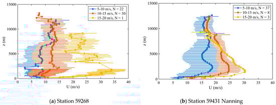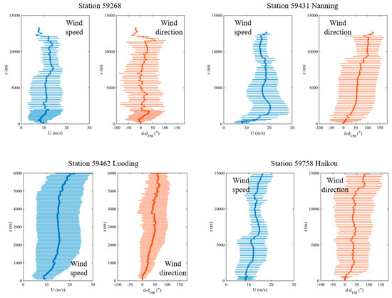Apart from the Xuwen profiler, the vertical wind profiles of Talim have also been analysed by using a number of other radar wind profilers. Figure 6 shows the results of the station 59268 and the station 59431 Nanning (locations in Figure 3a). Similar to the Xuwen profiler, there are clear signatures of the occurrence of a low-level jet at a height of around 1000 m. The low-level jet feature becomes more pronounced with increasing wind speed (i.e., decreasing distance to the storm centre). The height of the maximum wind speed, or the jet height, also tends to decrease with increasing wind speed. Such feature has also been reported in previous studies, e.g., Franklin et al. [13]; Giammanco et al. [4]; He et al. [14]. The low-level jet, also known as the supergradient boundary layer flow, is a prominent characteristic of tropical cyclones, especially near the eyewall. Its presence can be attributed to the boundary layer spin-up mechanism [15]. In the boundary layer of a tropical cyclone, the air loses its absolute angular momentum to the surface due to convergence. In certain inner radii of the cyclone, such as the eyewall, where the loss rate of absolute angular momentum is relatively small, the wind speed within the boundary layer can exceed that above it, resulting in a supergradient flow [16]. The existence of supergradient flow in the tropical cyclone boundary layer is supported by other observational studies [17,18] and numerical simulations [19]. The boundary layer wind speed profile below 1000 m has also been analysed (Figure 7). There are some kinks in the observed wind profiles, and the profiles show some deviation from the log law and power law. There are some possible explanations for this deviation. One possible cause is the development of an IBL due to the inhomogeneous terrain near the observation locations [20]. Another possible contributing factor is the topographic effects induced by nearby mountains [14]. As for the wind direction, winds generally rotate clockwise with height, not just within the atmospheric boundary layer but extending to a height of around, say, 6000 m or even 15,000 m based on the wind profiler data from the station 59268 and the station 59462 Luoding (Figure 8). As a result, based on various wind profiler data, the veering of winds with height is an important feature of the wind field of tropical cyclones for wind engineering applications.