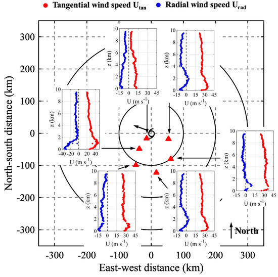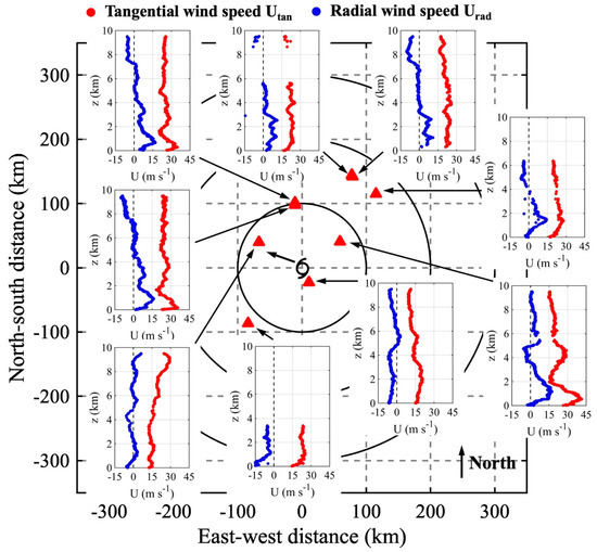 Vertical profiles of tangential (red) and radial (blue) wind speeds of Typhoon Talim at 0700UTC 16 July 2023. Tangential wind speed: anticlockwise positive; radial wind speed: outflow positive. Red triangles represent dropsonde locations relative to the storm centre.