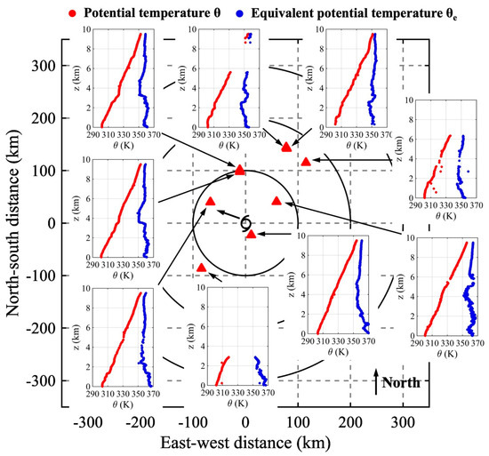 Vertical profiles of potential temperature (red) and equivalent potential temperature (blue) of Typhoon Talim at 0700UTC 16 July 2023. Red triangles represent dropsonde locations relative to the storm centre.
