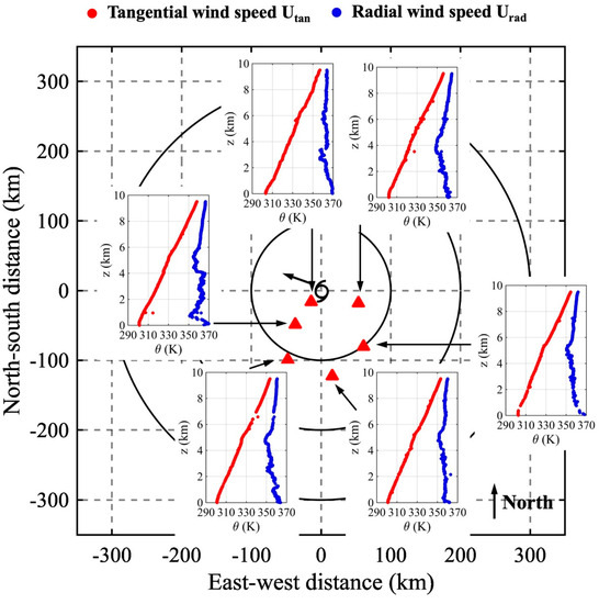 As in He et al. [24], the dropsonde data have been analysed by considering the radial/tangential flow and the equivalent potential temperature profiles. Dropsondes were launched on two days, namely, the 16 and 17 July 2023. The results are summarised in Figure 10, Figure 11, Figure 12 and Figure 13.
