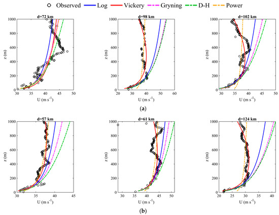 Fitting of selected vertical profiles of wind speeds in the lowest 1000 m near the eyewall of Typhoon Talim (a) at 0700UTC 16 July 2023 and (b) at 0200UTC 17 July 2023 to the wind profile models, including the logarithmic law, Vickery et al. (2009) model, Gryning et al. (2007) model, Deaves and Harris (1978) model, and power law. d represents the distance to the storm centre.
