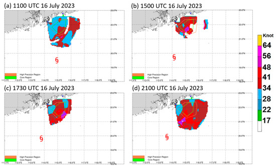 Wind speed observations from the ocean radar pair of Hong Kong and Shanwei. The tropical cyclone symbol marks the position of Talim as determined from surface observations and satellite fixes. (a) 1100 UTC, (b) 1500 UTC, (c) 1730 UTC, and (d) 2100 UTC, 16 July 2023.
