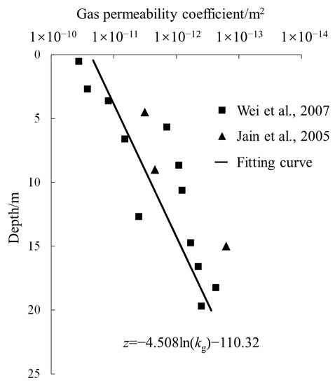 Based on actual measurements of gas permeability coefficients at different depths from the research of Wei et al. [31] and Jain et al. [30], the values of α and β were approximated as 0.22 (m−1) and 2.26 × 10−11 (m2), respectively. These values were calculated with the surface serving as the coordinate origin and are shown in Figure 2.