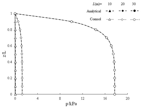 To validate the accuracy of the proposed analytical solution, the finite element numerical calculation software Comsol was used to compare and verify an example. An extremely fine predefined mesh size was applied in the numerical model, with the configuration of meshes containing 100 elements and the relative tolerance set as 0.001 [32,33,34]. The boundary conditions of the case included a combination of a constant pressure boundary at the upper boundary and a constant flux boundary at the lower boundary. The analytical solution was then calculated using Equations (10), (16) and (17).