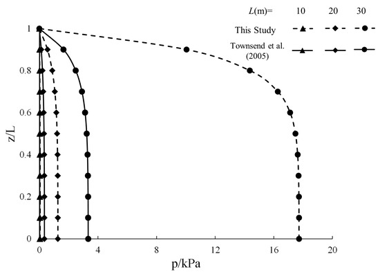 Without considering the variation of gas permeability coefficients with burial depth, the maximum gas pressure reached 0.35 kPa at the bottom within a depth range of 20 m when the thickness was 20 m, and 3.3 kPa at the bottom within a depth range of 30 m when the thickness was 30 m. Under the condition of considering the variation of gas permeability coefficients with burial depth, the landfill gas pressure also increased with increases in burial depth. Under the same pile thickness, when the burial depths were identical, the gas pressure values that took into account the variation of gas permeability coefficients with burial depth were found to be greater than those that did not consider it. It can be concluded that the gas pressure calculated by the proposed method is up to five-times higher than the existing solution proposed by Townsend et al. [25], illustrating a serious accumulation of landfill gas by the relatively low permeability of the pile at a high burial depth.