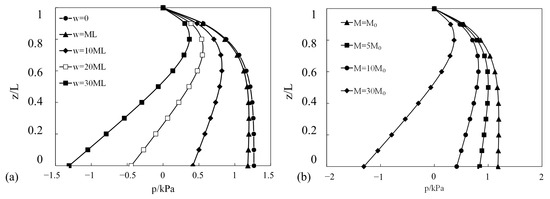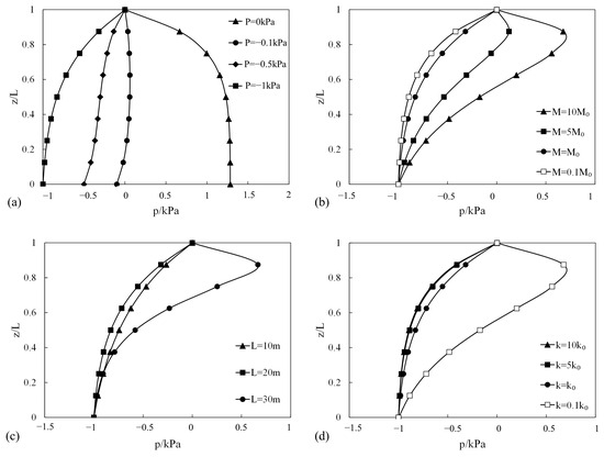 Using the 20 m-thick waste pile model as the prototype, the impermeable lower boundary was subjected to a gas extraction condition with an extraction flux of ML (ωl = QgL; the gas extraction rate is equal to the gas generation rate inside the pile). Moreover, the effects of the gas extraction rate, gas generation rate inside the pile, pile thickness, and gas permeability coefficient on the gas pressure distribution inside the waste pile using gas extraction at the bottom were analyzed respectively, as presented in Figure 5.