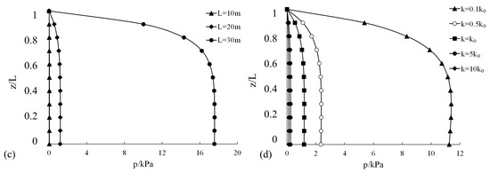 Firstly, the analysis of the gas pressure distribution of landfill piles with an impermeable bottom was conducted, and the parameters used in the model calculation were the same as those used in the previous example—illustrated as dashed lines in Figure 4. For comparison, the results of the one-dimensional steady-state gas pressure distribution without consideration of the variation of gas permeability coefficients with burial depth are also plotted as solid lines in Figure 4, according to the analytical solutions proposed by Townsend et al. [25]. Under this working condition, the bottom of the landfill pile was impermeable, and the generated landfill gas migrated to the top, and finally escaped to the atmosphere. The gas pressure on the top was the atmospheric pressure, and the landfill gas pressure increased as burial depth increased, with the landfill gas pressure at the pile bottom being the largest.