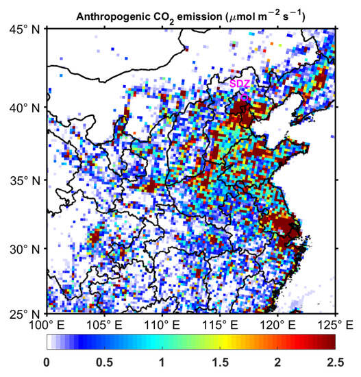 Geographical location of Shangdianzi (SDZ) station (represented by a circle) in China and the distribution of 0.5° × 0.5° anthropogenic CO2 emissions in March 2021 obtained from the Open-source Data Inventory for Anthropogenic CO2 (ODIAC) emission dataset.
