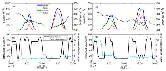 Variation of the hourly mean (a,b) global shortwave irradiance (GSWI), direct shortwave irradiance (DSWI), diffuse shortwave irradiance (DifSWI), and downward longwave irradiance (DnLWI), and (c,d) total cloud fraction and water vapor pressure on 15–16 and 28–29 March 2021, at SDZ.