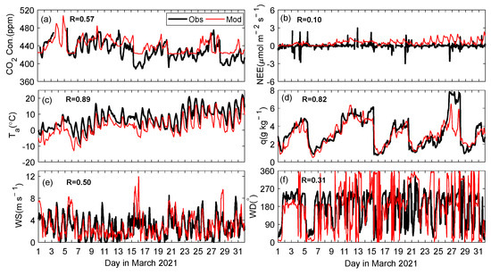 Comparison of the hourly mean (a) CO2 concentration, (b) CO2 flux (NEE), (c) air temperature, (d) specific humidity, (e) wind speed, and (f) wind direction in March 2021 observed at SDZ with that simulated with the WRF-VPRM. Correlation coefficients (R) between simulated and observed values for each parameter are also shown in the corresponding subplot.