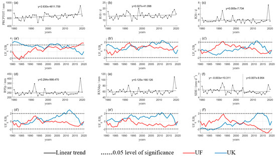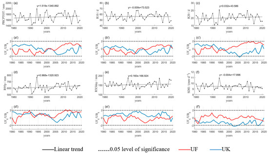 Variation trend and mutation characteristics of extreme precipitation in region IV of Lancang-Mekong River Basin from 1980 to 2020. Note: (a–f) represents the trend of changes in each index, (a’–f’) represents the mutation characteristics of each index.