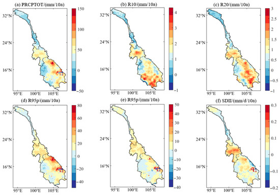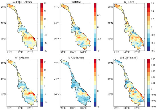 Figure 4 shows the spatial distribution of the change rates of extreme precipitation indexes in the Lancang-Mekong River Basin during 1980–2020. In region I, the change rate of PRCPTOT presented an increasing–decreasing–increasing trend from north to south, and the maximum increase rate is concentrated in the north, about 8~13 mm/10a. The rates of change of R10, R20, and R95p were the same as that of PRCPTOT, and their maximum increase rates were also concentrated in the northern region. The maximum rate of RX5day change was concentrated in the northern part of the country, while the rate of change was unchanged or slightly increased in other regions, and the increase rate was concentrated in the range of 0~3 mm/10a. The maximum change rate of SDII was concentrated in the central and southern regions, and the change rate of other regions was about −0.01~0 (mm·d−1)/10a. On the whole, the change rates of the extreme precipitation indexes in this region showed an increasing trend in most areas, and the maximum of the indexes’ change rates were mainly concentrated in the northern region, where the terrain was mostly glaciers, bare land, and grasslands. The relief of the terrain became larger and the drainage basin became narrower to the south, and the extreme precipitation would rapidly gather and lead to the occurrence of flood disasters.