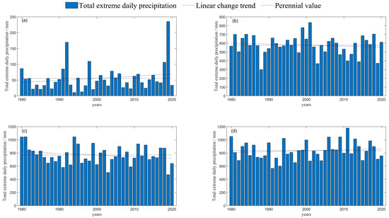 Trends of extreme precipitation events in the Lancang-Mekong River Basin from 1980 to 2020. Note: (a–d) represent extreme precipitation events in region I to region IV, respectively.