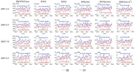 In region II, under the scenario of SSP1-2.6, the indexes change rates gradually increase from north to south. Except for R10, the maximum of the index change rate is in the south-central region, the maximum of the other indexes’ change rates are concentrated in the southern region. Under the scenario of SSP2-4.5, all the indexes change rates increase first and then decrease from north to south, and the maximum change rates are concentrated in the south-central region. Under SSP3-7.0, the change rate of PRCPTOT increases gradually from north to south, and the change rate of RX5day decreases first and then increases from north to south. In most areas, the change rate of RX5day is concentrated in the range of 0~10 mm/10a, and only in a small part of the central area, the change rate decreases slightly. The change rates of other indexes show a trend of increase–decrease–increase from north to south, and the maximum change rates of all indexes are concentrated in the southern region. Under the scenario of SSP5-8.5, the change trend of each index change rate is mostly the same as that of SSP1-2.6, and the maximum value of each index change rate is concentrated in the southern region.