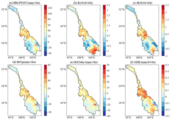 Spatial distribution of extreme precipitation indexes change rates in Lancang−Mekong Basin.
