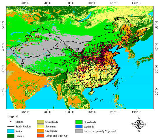 China is situated in eastern Asia, along the western coast of the Pacific Ocean. It stretches from the center of the Heilongjiang River near Mohe in the north to Zengmuansha in the Spratly Islands in the south. From a west-to-east perspective, it extends from the Pamir Plateau to the confluence of the Heilongjiang and Ussuri Rivers. China is a vast country with a land area of 9.6 million square kilometers (3°51′–53°33′ N, 73°33′–135°05′ E). The topography varies, with lower elevations in the east and higher elevations in the west. China experiences a diverse range of climate types and topography, spanning tropical, subtropical, warm temperate, middle temperate, and cold temperate zones from south to north. The country’s land cover types also exhibit significant variation among provinces (Figure 1). Grasslands, for instance, are primarily found in regions such as Inner Mongolia Autonomous Region, Tibet Autonomous Region, and Qinghai Province. Southern provinces of China are predominantly covered by savannas. Central regions, such as Shandong Province and Henan Province, are characterized by arable land, which also serves as the primary distribution area for ground stations. Consequently, the spatial and temporal distribution of SM varies greatly across different provinces and regions of China. To accurately analyze the spatial and temporal variations in SM in different provinces and regions of China, this study evaluated three classical SM products on a province-level basis. This approach enables a more precise examination of SM characteristics across various regions within the country.