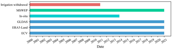 Since the SM data and auxiliary data used have different spatial resolutions and formats, all data need to be pre-processed. All data were converted to “tif” format, geographic coordinates were set to GCS-WGS-1984, and all SM data units were standardized to volumetric water content (m3/m3). The four irrigation withdrawal datasets were averaged. The ERA5-Land and precipitation data were resampled to 0.25° using the nearest neighbor method, and the GLDAS and ECV data were resampled to 0.1° using the bilinear interpolation method. Land cover data and irrigation withdrawal data were also reclassified to two spatial scales. Finally, all data were uniformly cropped to the study area. This resulted in SM data and auxiliary data at both scales. The time-series lengths of the data used in this study are depicted in Figure 2.
