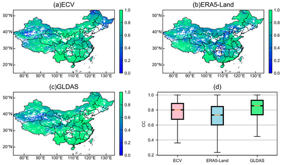 Spatial distribution of (a) ECV; (b) ERA5-Land; (c) GLDAS; and box plot (d) of CC at 0.1° based on ETC analysis.