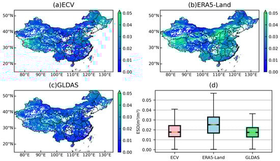 Spatial distribution of (a) ECV; (b) ERA5-Land; (c) GLDAS; and box plot (d) of ESD at 0.1° based on ETC analysis.