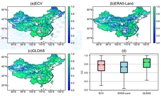 Spatial distribution of (a) ECV; (b) ERA5-Land; (c) GLDAS; and box plot (d) of CC at 0.25° based on ETC analysis.
