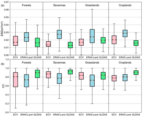 Box plot of (a) ESD; and (b) CC at 0.1° based on ETC analysis on four land cover types.
