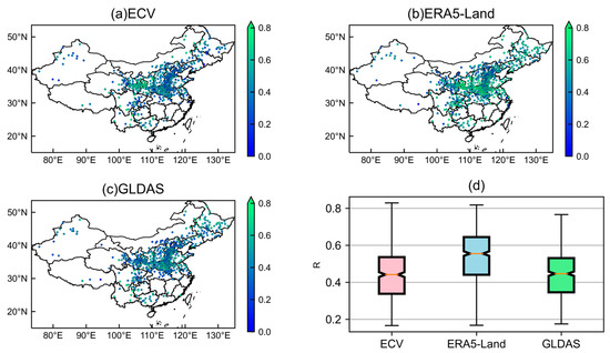 Spatial distribution of (a) ECV; (b) ERA5-Land; (c) GLDAS; and box plot (d) of R-verified in situ observations on 0.1°.