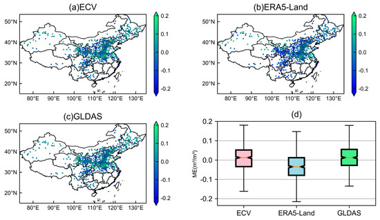Spatial distribution of (a) ECV; (b) ERA5-Land; (c) GLDAS; and box plot (d) of ME-verified in situ observations on 0.1°.