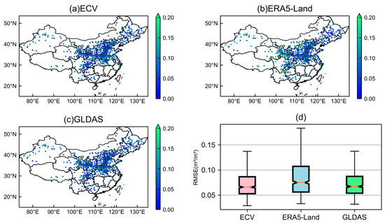 Spatial distribution of (a) ECV; (b) ERA5-Land; (c) GLDAS; and box plot (d) of RMSE-verified in situ observations on 0.1°.