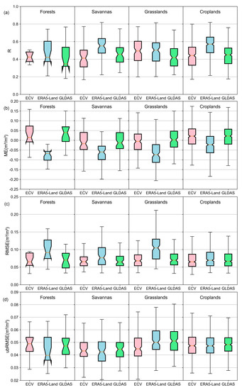 Box plots of (a) R; (b) ME; (c) RMSE; and (d) ubRMSE against in situ observations on different land cover types.